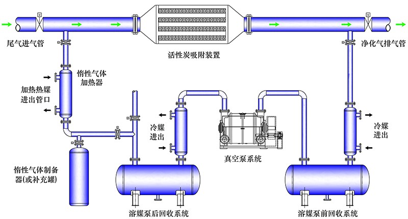 我公司設(shè)計生產(chǎn)的活性炭脫附裝置,是根據(jù)不同吸附質(zhì)的沸點和臨界點,用一定溫度下的惰性氣體將吸附質(zhì)析出。惰性氣體經(jīng)過加熱器加熱到一定溫度進入飽和活性炭裝置系統(tǒng),惰性氣體將飽和活性炭內(nèi)的吸附質(zhì)加熱到沸點,吸附質(zhì)隨小分子惰性氣體揮發(fā)出來進入冷凝器通過一次冷媒冷凝,大部分吸附質(zhì)冷凝成液體進入溶媒回收系統(tǒng)氣液分離與惰性氣體分開。物質(zhì)的吸附量是隨壓力的升高而升高的,隨壓力的降低而降低。含有少量吸附質(zhì)的惰性氣體經(jīng)真空泵減壓后進入二次冷凝器,經(jīng)二次降溫冷凝將少量的吸附質(zhì)分離回收。處理后的惰性氣體再經(jīng)干燥器干燥,加熱器加熱進入活性炭吸附裝置,循環(huán)使用。在實際工作中,這種方法也是常用的脫附方法。